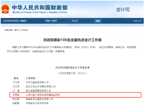 近日,财政部表彰100名全国先进会计工作者,瑞金医院财务处处长李雪辉荣获该称号。